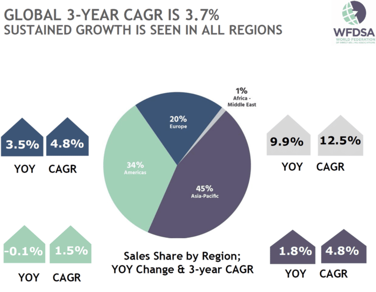 Dans le monde la Vente Directe c’est 74.013.441 vendeurs avec un Chiffre d’Affaires de 118 milliards d’US Dollars.