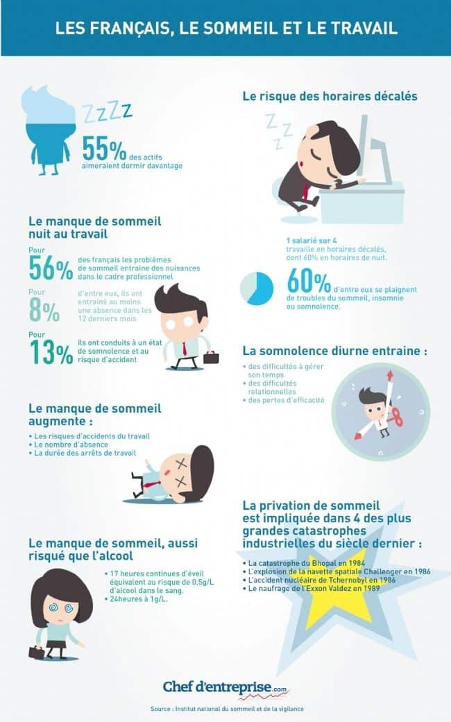 Une infographie de Chef D’entreprise.com relate ci-dessous tous les dangers de l’insomnie du travailleur en général.